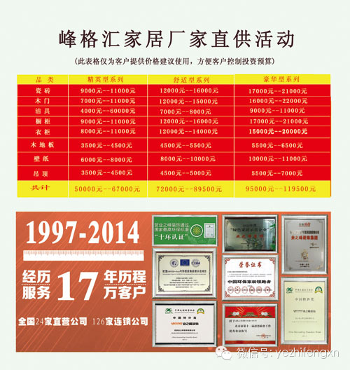 《业之峰环保契约》:签订《室内装修环保协议》,环保不达标全额退款! 《业之峰服务契约》:设计一对一专享定制服务,主材一对一管家式服务! 《业之峰质量契约》:签订《工程质量承诺书》,保障工程质量,工程质量标准化! 《业之峰保值承诺》:今年定装修,明年不涨价! 业之峰优惠双重奏第一波