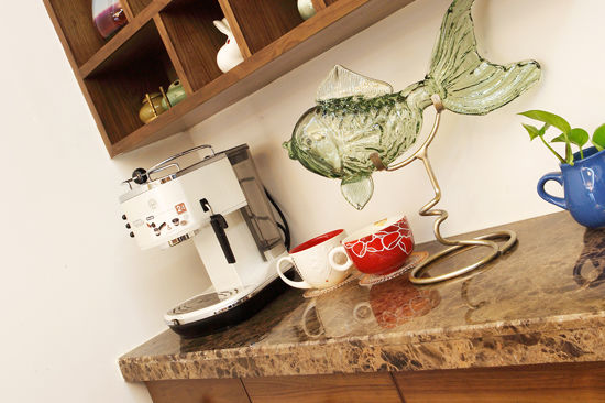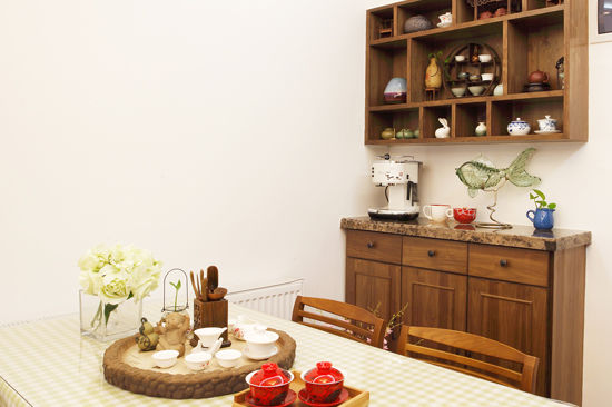 设计亮点:在柜子上方,利用立体空间,放置一个小架子,并分设多格,可用于摆放主人的茶具。天然木质架子与传统青花瓷茶具搭配,相得益彰。下方的金鱼饰品,俏皮可爱,绿植的清新,为整个空间融入了不少明快情愫。